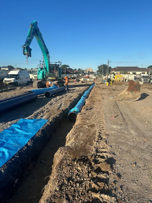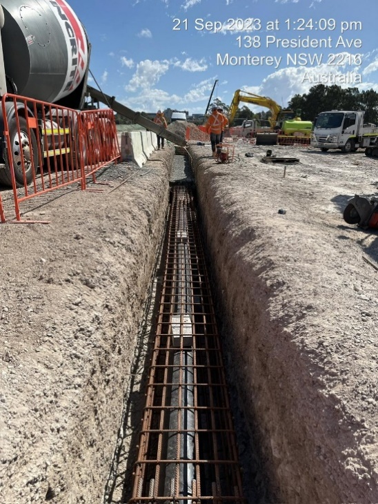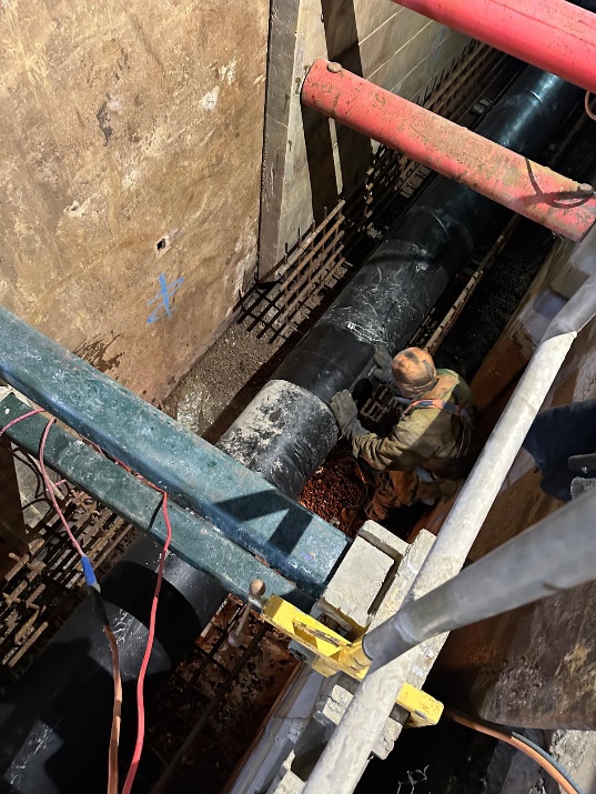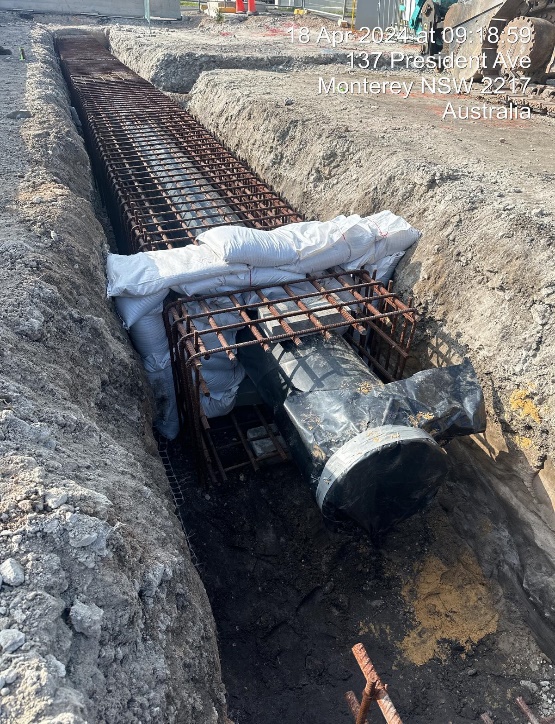 This project involved the relocation of potable water mains ranging from 100mm to 450mm, constructed from ductile iron and steel concrete-lined pipes. It also included multiple house connections, with 14 new connections to the existing main. The majority of the water mains were installed during 56-hour shutdown weekends, and were concrete-encased. The installation depths ranged from 1 meter to 3.5 meters in water-charged and occasionally contaminated ground conditions.