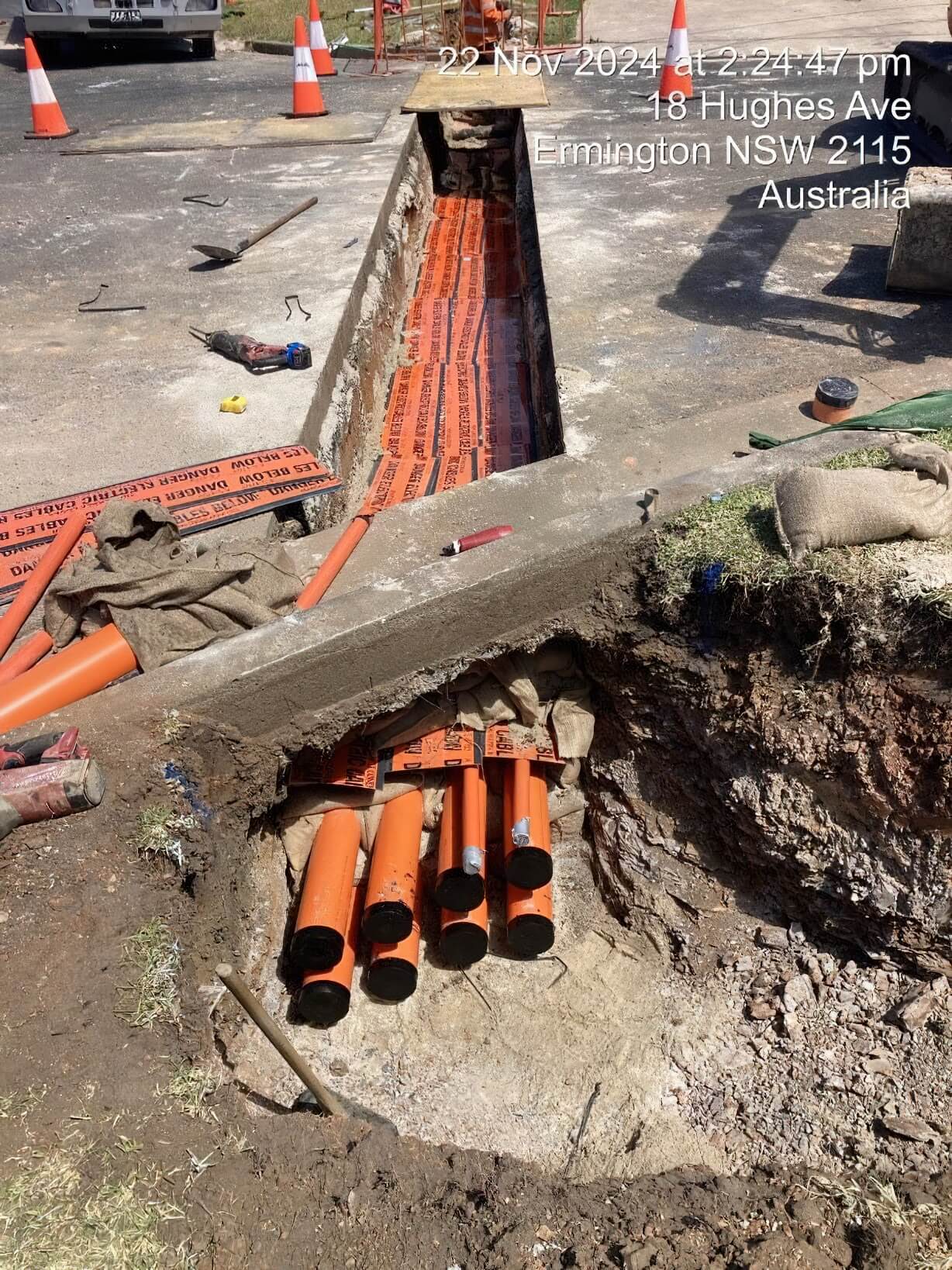 This project involves the excavation and installation of 8 x 125mm conduits over a 2.8 km stretch, running through the backstreets of Rydalmere, Ermington, and into the new Melrose Park subdivision. The scope also includes a directional bore (HDD) under Victoria Road and the full permanent restoration of roads, footpaths, and driveways.